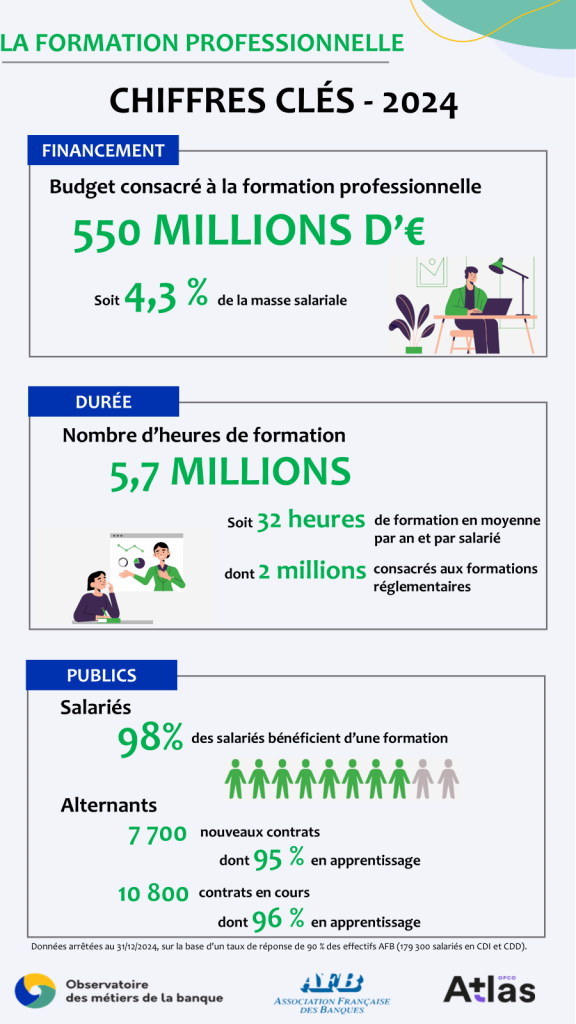 Les banques AFB ont investi 550 millions d’euros dans la formation professionnelle en 2024, soit 20 millions d’euros de plus qu’en 2023. Par ailleurs, 5,7 millions d’heures ont été consacrées au développement des compétences et des carrières des salariés, soit une progression de 4 % par rapport à 2023. Cet investissement a permis à la quasi-totalité des collaborateurs de bénéficier d’au moins une action de formation, illustrant la volonté affirmée d’accompagner l’ensemble des collaborateurs au regard des évolutions du secteur.